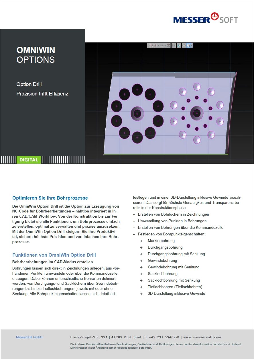 Die OmniWin Option Drill ist die Option zur Erzeugung von NC-Code für Bohrbearbeitungen – nahtlos integriert in Ihren CAD/CAM-Workflow. Von der Konstruktion bis zur Fertigung bietet sie alle Funktionen, um Bohrprozesse einfach zu erstellen, optimal zu verwalten und präzise umzusetzen. Mit der OmniWin Option Drill steigern Sie Ihre Produktivität, sichern höchste Präzision und vereinfachen Ihre Bohrprozesse.
