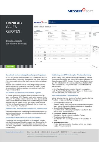 Die schnelle und zuverlässige Erstellung von Angebotenist eine der größten Schwierigkeiten und Zeitfresser in der auftragsbezogenen Produktion. Verlieren Sie hier keine wertvolle Zeit mehr und eliminieren Sie alte Preise und falsche Kalkulationen! Meistern Sie diesen Prozess in der auftragsbezogenen Produktion schnell und zuverlässig mit OmniFab Sales Quotes. So unterstützen Sie Ihren Verkauf und gewinnen mehr Aufträge in kürzerer Zeit.